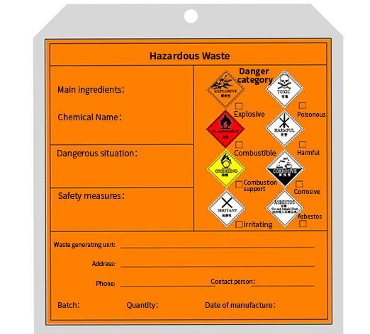 Identification tags include sticky type and hanging type. Sticky type hazardous waste labels are affixed to hazardous waste storage containers and packaging materials. Hanging type hazardous waste labels are suitable to be attached to hazardous waste storage containers and packaging materials that are not easy to stick firmly or inconvenient to stick but relatively easy to hang.